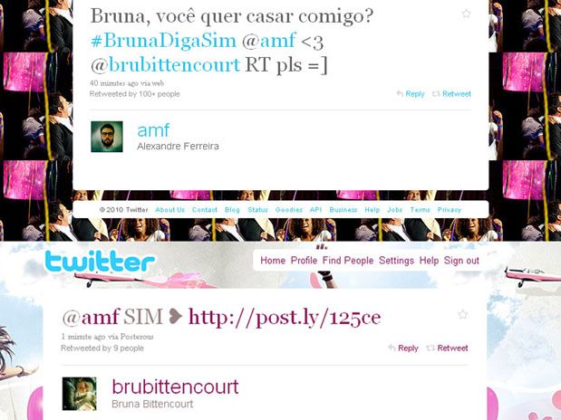 O Twitter tem sido um espaço para diferentes manifestações políticas, esportivas, cômicas e solidárias. Nesta terça-feira, ele foi ferramenta para uma declaração de amor. O programador web e fotógrafo de São Paulo, Alexandre Ferreira (@amf), usou o microblog para pedir em casamento a gerente de marketing online Bruna Bittencourt (@brubittencourt), também de São Paulo, através de um tuite.
