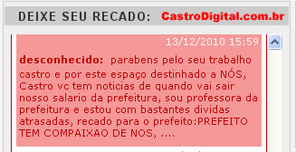 Na segunda-feira da semana passada (13 de dezembro) uma professora deixou um recado aqui no site que me chamou atenção: ela pede compaixão ao prefeito de Bacabal e que o mesmo pague os salários atrasados! Veja o print do recado na imagem ao lado ou procure-o no mural de recados do site localizado no canto inferior esquerdo desta página.