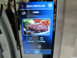 O microondas por sua vez, com acabamento interno em inox, exibe imagens coloridas de alguns pratos e é operado totalmente pela tela.