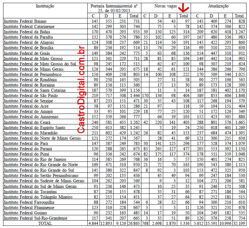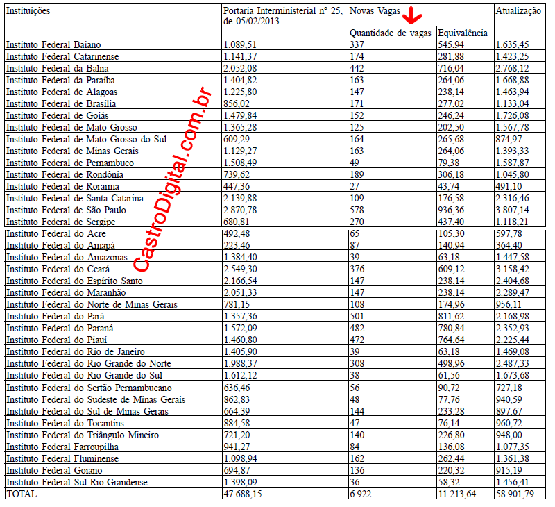 Nas tabelas mais abaixo, é possível ver a quantidade exata dessas novas vagas, na coluna indicada com a seta vermelha, nos Institutos Federais de todo Brasil.