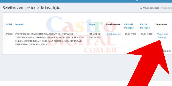 AVISO: o sistema de inscrição não funciona muito bem em telas estreitas de celulares, por isso, após se cadastrar e/ou fazer login com CPF e senha, vire seu celular na horizontal OU acesse preferencialmente pelo computador ou dispositivo com tela maior para ver o link de inscrição na extrema-direita da tela (veja imagem ilustrativa abaixo com a seta vermelha).